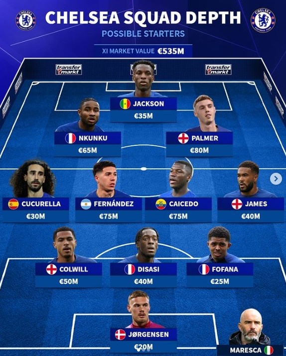 中场:库库雷利亚(3000万)、恩佐(7500万)、凯塞多(7500万)、詹姆斯(4000万)