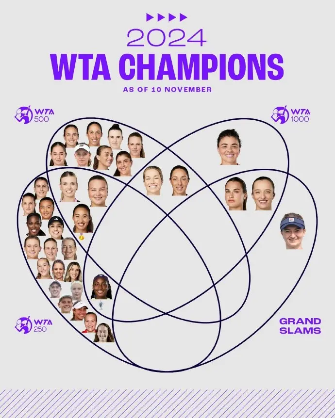 直播吧11月11日讯 2024赛季WTA礼貌征途,WTA官方微博晒出了本年WTA单打冠军散布图。